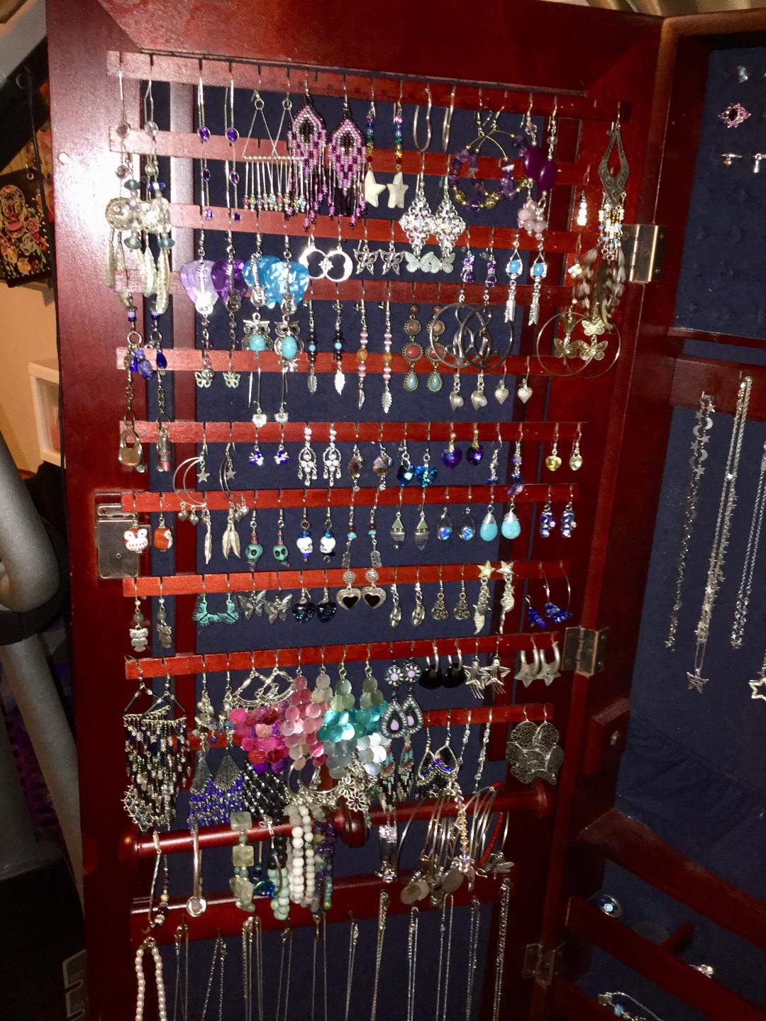 So you might remember that my Mom passed away last April. She had tons of jewelry & got a lot of stuff from QVC. She bought a lot of my jewelry. So my Dad gave some of the jewelry away to family members & there is still quite a bit left. But anyway, the armoire was empty, so I finally brought it to my house. I spent a few days getting my jewelry in it. That's not even all of my jewelry. But it's nice to be able to see it all & have it not get tangled. I have 3 ziplock bags of jewelry that I'm getting rid of too. I might get rid of some more of this if I end up not wearing certain things. I'm going to try to figure out what I wear more & what I don't wear at all.